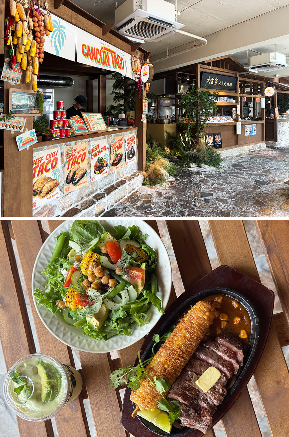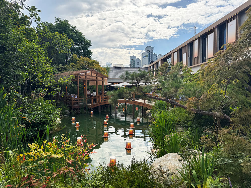 The bridge connecting the pond and pavilion at the entrance has become a popular photo spot, often with lines of people waiting to take pictures. At night, candles floating on the pond are lit, adding a romantic touch. Outdoor tables circle the pond, making it an ideal setting to savor seasonal moods alongside delicious food.