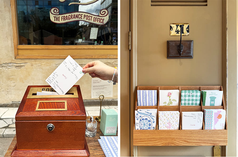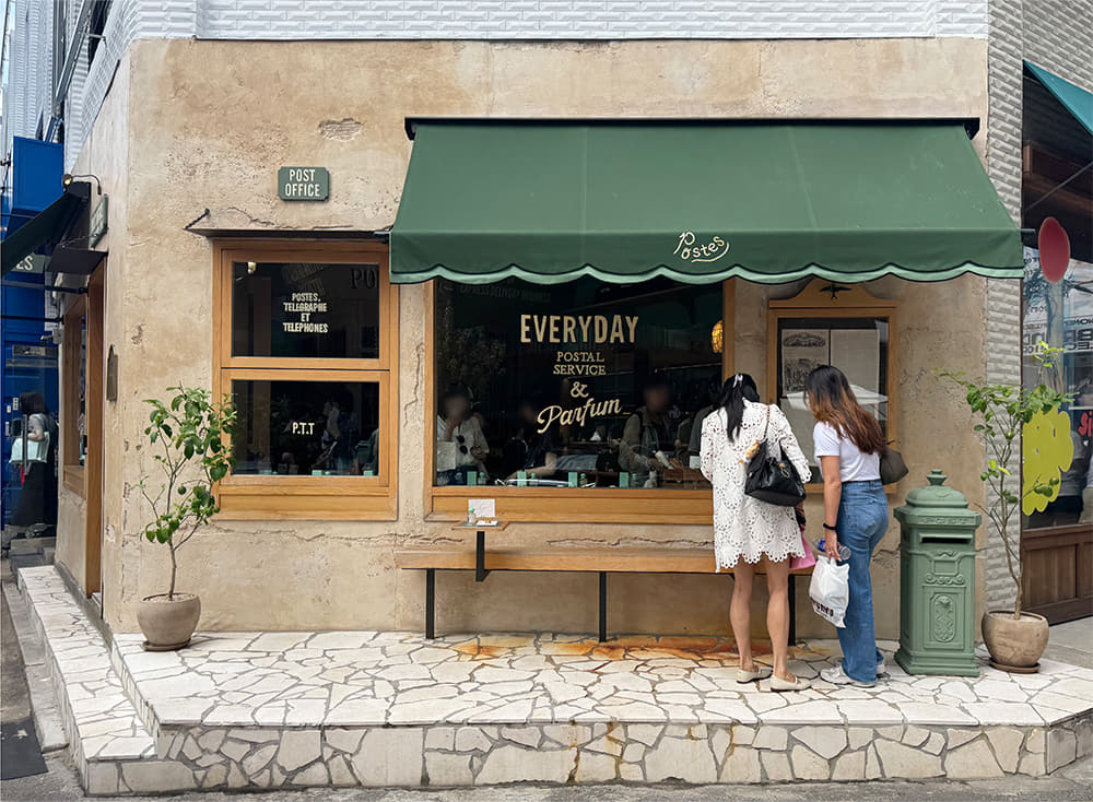 The boutique itself is designed as “a small post office delivering beautiful scents.” Styled like an old European post office, the space draws inspiration from weathered bronze mailboxes and mint-colored vintage stamps. The packaging reflects this, with artist Saki collaborating on a handwritten-letter motif. At Postes Seongsu, fragrance cards take the form of postcards. After sampling, visitors can write a note and slip it into a mailbox on-site, and Postes will mail it to the recipient free of charge. It is a way of gifting not only a message but also the memory of a scent.