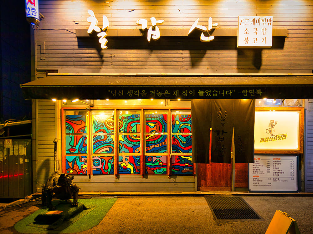 When the museum and cafés close, you can drift into the alleys behind Chang-dong Station. Here, you’ll find Radio Street, a local hotspot full of casual pubs, noraebang, and outdoor BBQ joints. For a last creative detour, walk toward the main road until you see a snarling monster sculpture made entirely of tires. Behind it, you’ll find Chilgapsan, a no-frills Korean restaurant with an art-house spirit, serving dishes like bulgogi and buchujeon (garlic chive pancake) with all the trimmings. On warm nights, tables spill into the streets, and the scent of grilled meat hangs in the air in this wonderfully creative neighborhood.