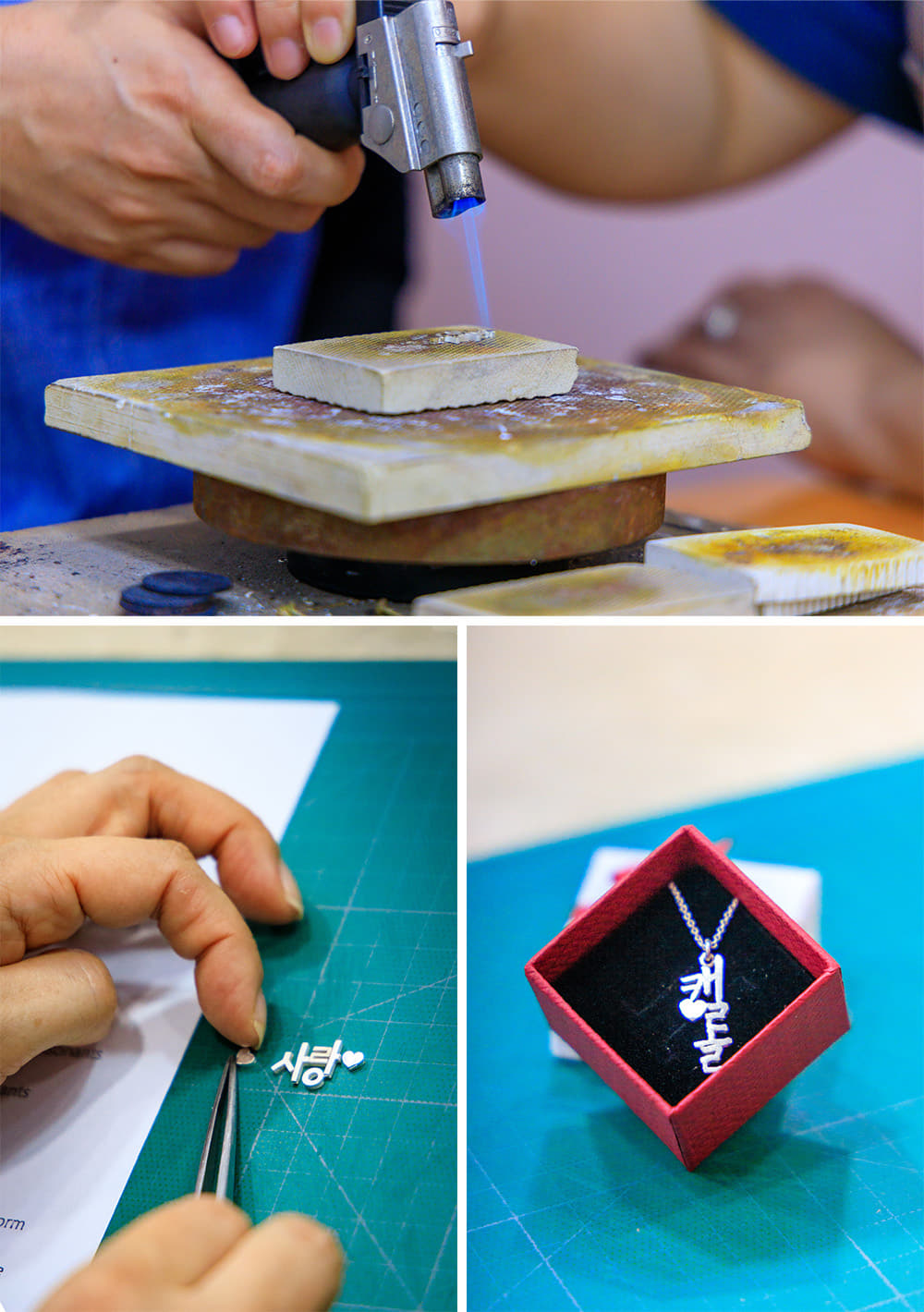 At first, I could not decide: necklace, bracelet, or earrings? But soon, I settled on an idea and began picking and arranging the letters. Park encouraged me, showing how to line them up and then teaching me how to flex and solder the metal together. By the time I polished the necklace and held it in my hand, I felt like I had walked out with more than just jewelry. I was carrying a piece of Seoul, sanded and shaped with my own hands.