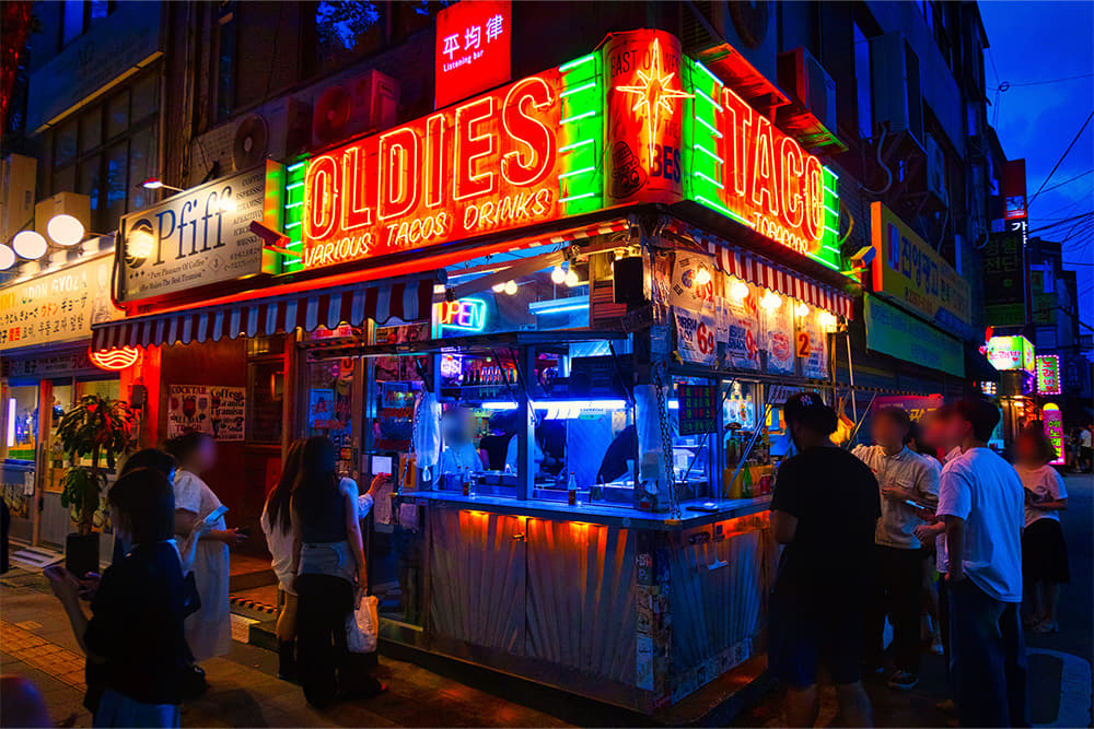 Seoul has no shortage of trendy food, but stumbling onto Oldies Tacos in Euljiro felt different. Its colorful sign and upbeat vibe stood out against the weathered buildings around it. There are two locations just meters from each other, but most people are drawn to the neon-lit corner spot.