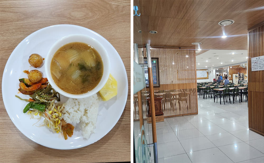 It’s time for lunch, graciously called the ‘offering’ because it symbolizes gratitude and generosity. We are led to the second-floor canteen where we serve ourselves from a simple but plentiful buffet of soup, rice, and vegetable side dishes. We’re reminded to only take what we can finish. On the wall, there is a small paragraph translated into 4 languages, a reminder to receive the food humbly and graciously.