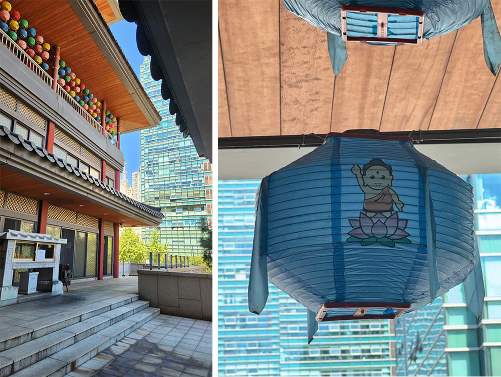 Lunchtime is over, allowing me some free time before the second half of the program. I take this opportunity to explore the temple. The International Seon Center is a city temple, neighboring a middle school, apartments, and offices. From the terrace on the second floor, I can hear the middle school students in a fierce game of basketball across the street. I can see office workers finishing their lunch breaks and rushing back to their desks with coffee in hand. And yet, the rush of daily life in Seoul feels distant, and there’s an overwhelming sense of calm on the terrace. Wind chimes dangle in the breeze, and candle flames dance gently behind a glass frame.