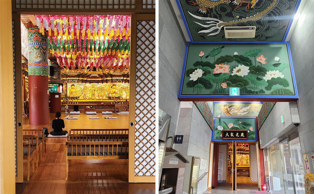 The second floor of the International Seon Center is the most impressive. Here, you can see the Great Dharma Hall, the heart of the temple. But before we even reach the Hall, something else catches my eye. The ceiling in the hallway is adorned with intricate paintings of Korean tigers and Buddhist motifs. At the end of the corridor, a small door marks the entrance to the Great Dharma Hall. Gold light spills out from the door.