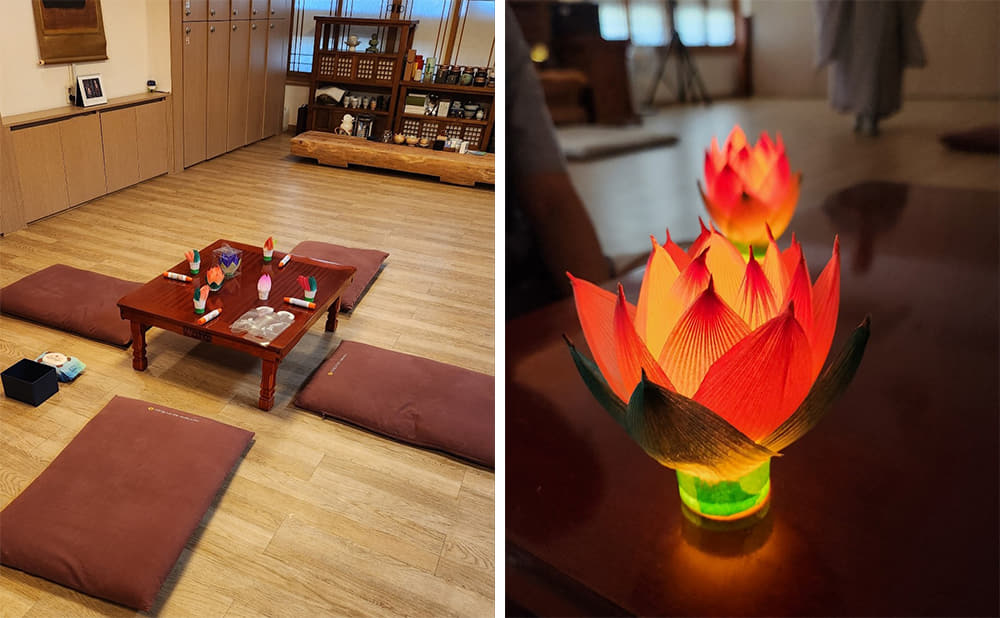 Just a short walk from Omokgyo Station (Line 5, Exit 8), the International Seon Center holds a stillness that can be felt from across the street. Upon arrival, I’m greeted at the fifth floor, asked to remove my shoes, and given a vest to wear over my clothes. I join seven other visitors in a softly-lit wooden room for orientation. We watch a short video sitting on cushions on the floor, and the guide gives us a brief overview of temple etiquette. He emphasizes that this Templestay program is not just a way to sightsee Korean Buddhism, but a chance to reflect on our busy lives. With orientation complete, it’s time to meet the practicing monk who will lead our meditation session.