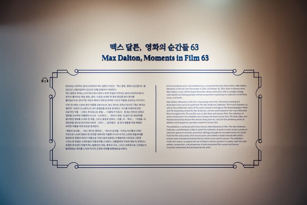 Three special exhibitions are held throughout the year, and currently, 63 Art is presenting the global illustrator Max Dalton’s solo exhibition. With a total of 104 pieces of artwork on display, this exhibition consists of three sections, including “Moments in Film,” “The Wes Anderson Collection,” and “Moments in Max.” An artwork produced especially for Korean fans will also be released for the first time in this exhibition.